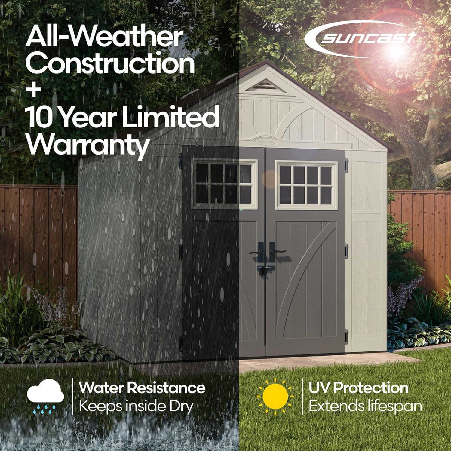 The Suncast 8' x 7' Heavy-Duty Resin Tremont Storage Shed is the perfect solution for keeping your outdoor space organized and your equipment protected. Built with multi-walled polypropylene resin panels, this durable outdoor shed is engineered for long-lasting strength and stability, withstanding harsh weather conditions and the rigors of daily use. Its spacious 8' x 7' footprint provides ample room to store power equipment, long-handled tools, ladders, bikes, and other outdoor essentials. The reinforced heavy-duty floor supports even the heaviest items, such as lawnmowers or tractors, ensuring reliable functionality. Strategically placed skylights and windows let in natural light, brightening the interior without compromising the shed's structural integrity. The double doors feature a padlock hasp for secure storage, giving you peace of mind knowing your belongings are safe. With a stylish cream finish that complements any outdoor setting, the Suncast Tremont Storage Shed is a functional and aesthetically pleasing addition to your yard.