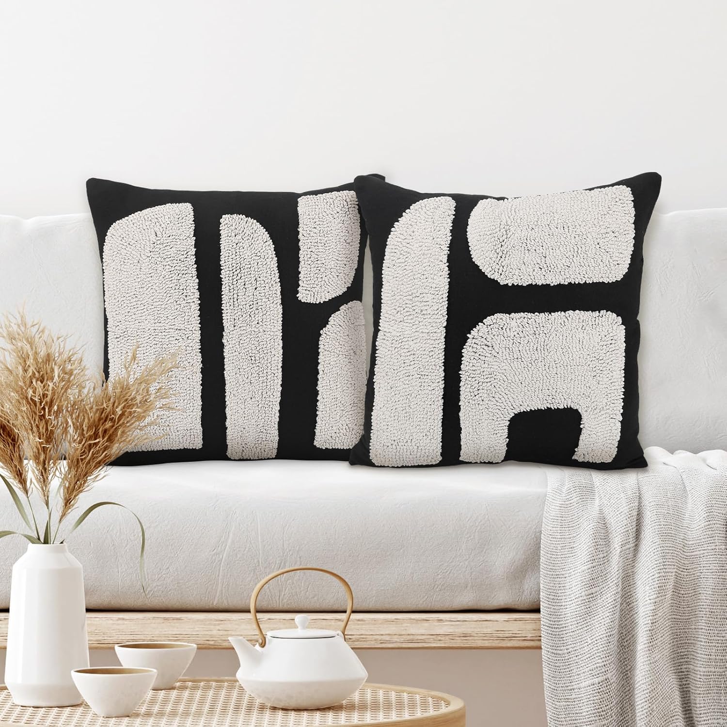 2 Pcs Black White Throw Pillow Covers Boho Chunky Tufted Pillow Cover 18 x 18 Inches Modern Woven Decorative Pillows Cases Abstract Pillows Sham for Living Room Bed Sofa Couch Features: Good Material: Our black throw pillows sham is made with polyester, soft to the touch and durable whether used indoors or outdoors; due to the neutral design, tossed in your bedroom, guest room, or any space, our abstract pillows sham can create a modern boho vibe. Great Design: The modern woven decorative pillows cases are embroidered with simple and powerful patterns on the front, complemented by classic black-and-white minimalist design, and here is a sturdy hidden zipper fastens at the bottom. Specifications: Color: black and white Material: polyester Size: as pictures shown Package includes: 2 x Black White Throw Pillow Covers Note: Manual measurement, please allow slight errors on size. The color may exist a slight difference due to different screen displays.