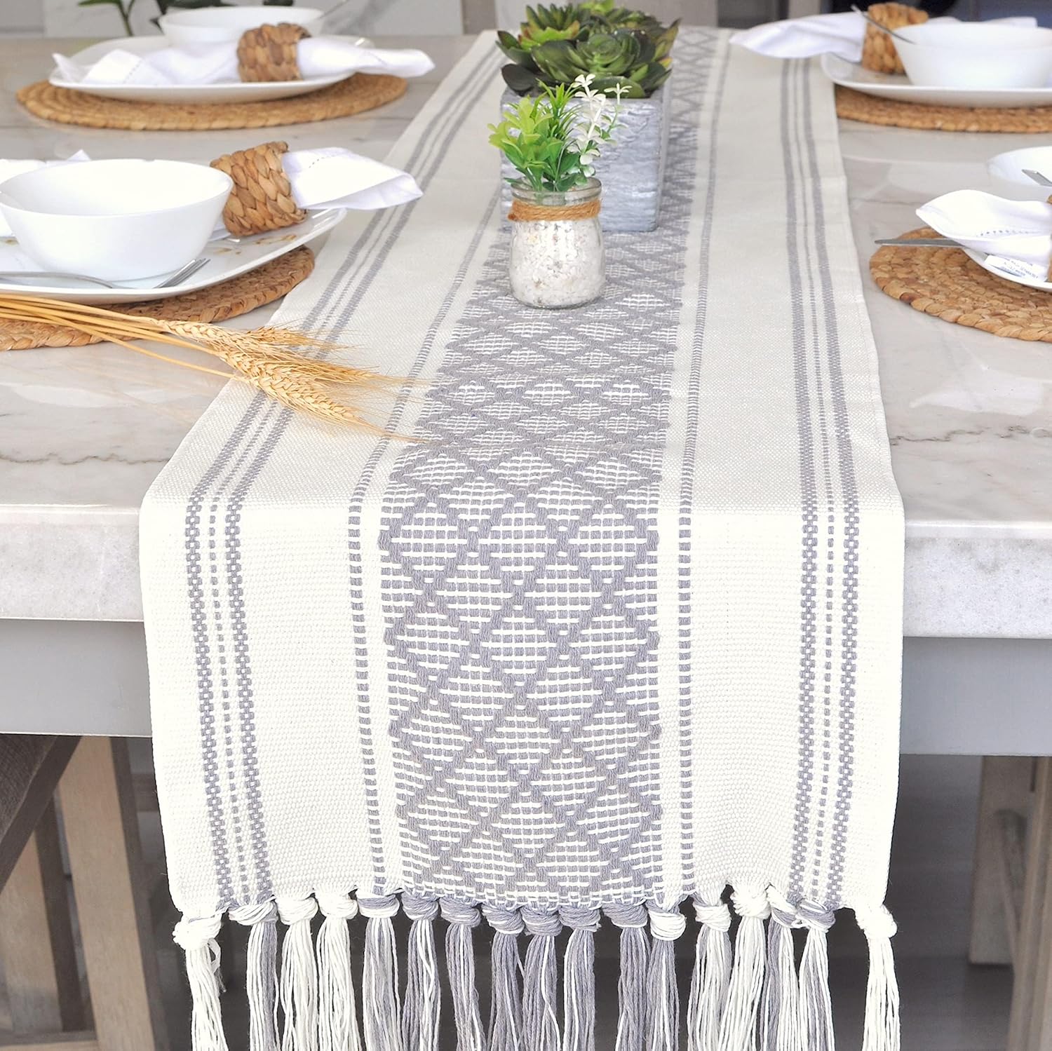 This beautiful blue and beige bicolor table runner, featuring elegant tassels for added texture. Whether you’re decorating your dining room for a cozy family dinner, adding a stylish accent to your kitchen island, or elevating your living room or bedroom décor, this versatile runner is perfect for every space. Ideal for weddings, holidays, and special occasions, it brings warmth and sophistication to any setting. Durable and easy to maintain, it’s the ideal piece for both everyday use and festive celebrations.