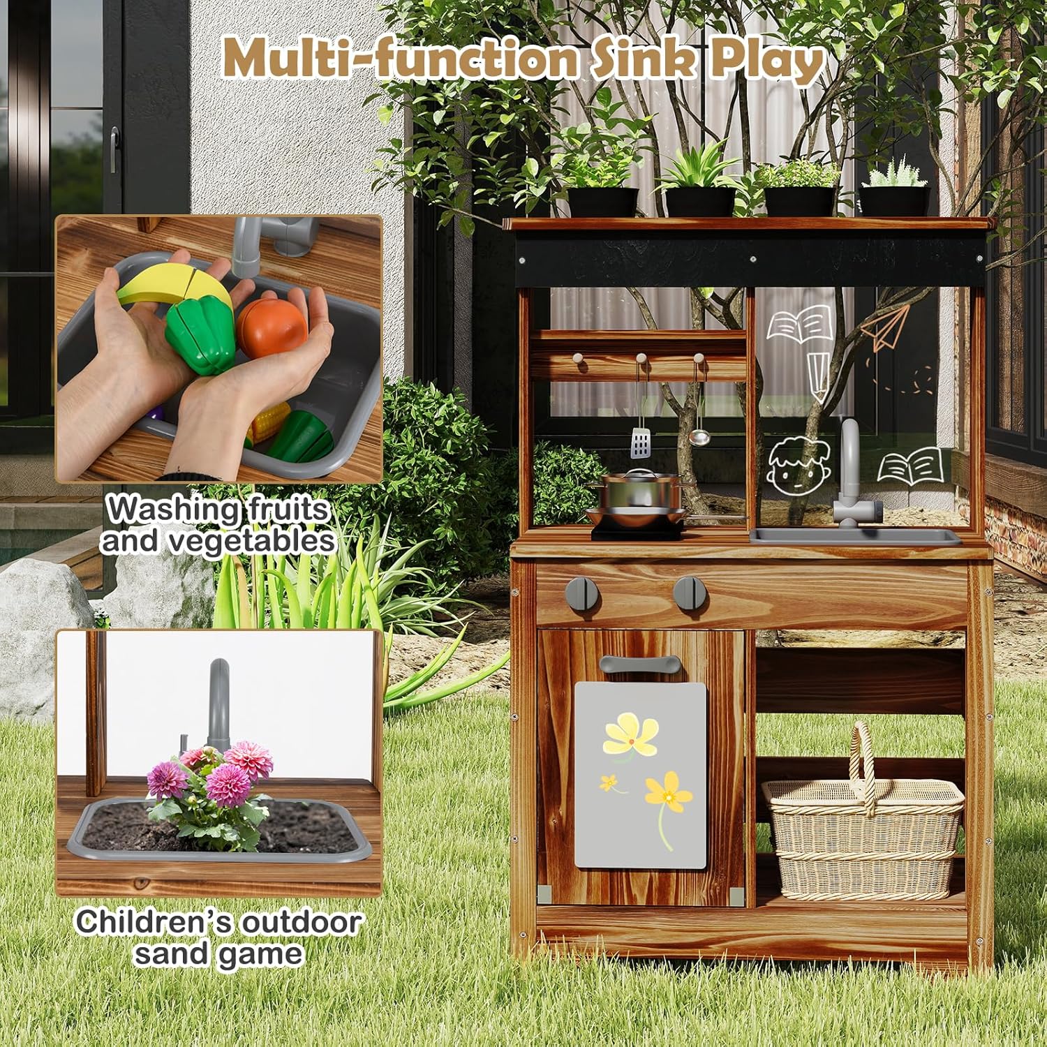 Why do you choose INFANS Mud Kitchen? This kids wooden kitchen is a versatile and engaging playset, made of high-quality fir wood and featuring an innovative dual design that allows children to draw with colored markers on the drawing board while simulating cooking in the kitchen area. Additionally, the outdoor kitchen is equipped with 4 flower pots and a sink, making it convenient for children to plant flowers and herbs. This toy kitchen can help children aged 3 and above unleash their imagination, creativity, sensory exploration and more.Features: Includes stainless steel double-handled pots, frying pans, spoons, and spatulas 4 movable flower pots, showcasing different types of plants A movable dry sink allows children to mix mud Allows children to draw on the doodle board with colored markers/pens Multiple storage options keep items organized and easily accessible Promotes cooperation and communication Recommended for kids 3 years old and up Ideal present for birthdays and special occasionsSpecification: Color: Brown Material: Fir Wood, Plastic, Stainless Steel Product Dimensions: 27" x 14" x 38"(L x W x H) Countertop Height: 21" Net Weight: 16.5 lbs Suitable Ages: 3+ Years Old Package Includes : 1 x Play Kitchen 1 X Multiple Kitchen Accessories 1 x Instruction