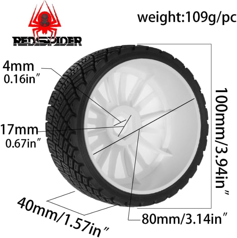 You will get: 4PCS* 1/8 RC On-Road tiresMaterial used: rubber + nylon plastic【Size】Hexagonal size: 17mm;Tire inner diameter: 80mm/3.15 inches;Tire outer diameter: 100mm/3.94 inches.Tire width: 40mm/1.57 inches.Weight: 436/4pcsPacking list:4PCS * 1/7 RC racing wheels and tires✔ Due to manual measurement. Please allow a measurement error of +/- 1-2mm✔Use Note: We strongly recommend using professional tools for installation, otherwise, the rc rally tire adapter may be severely worn out!