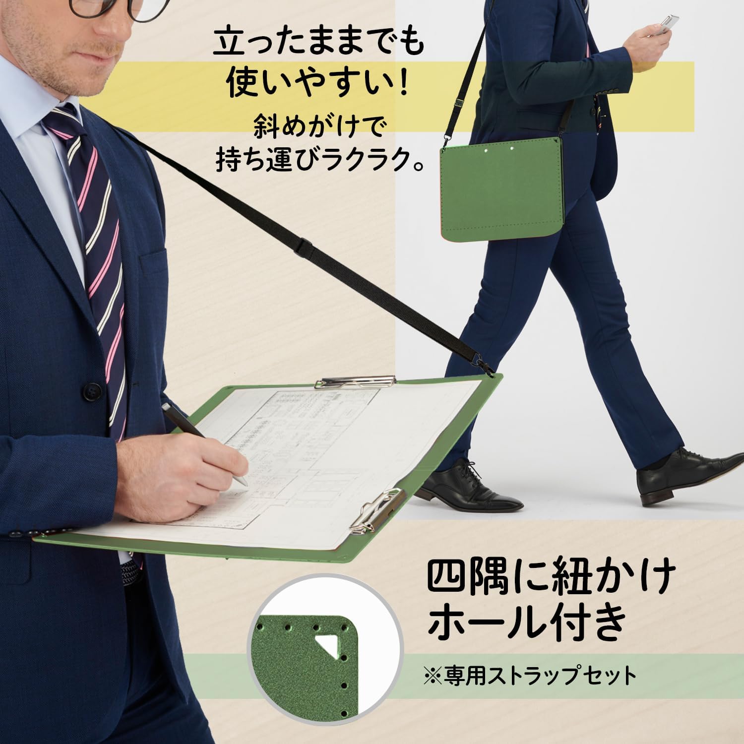 A3 size when using Easy to carry clipboard that folds to A4 size. A3 size clipboard is a must have on the field. But it is a problem with bulky. Since everyone can use it while writing and watching it, even if your tablet or smartphone become mainstream, the drawings have a lot of paper output and is inconvenient to carry. The A3 Clipboard + folds to A4 size has been improved. Difficult to carry around with existing A3 clipboard problems. Bifold clipboard crease for improved writing Product Features 1.A3 size when using Flat crease for smooth writing 2.When folded, A4 size. Easy to carry in your business bag or backpack. 3. 4 corner eyelets. Hands free while in use or on the go. Comes with a convenient strap.