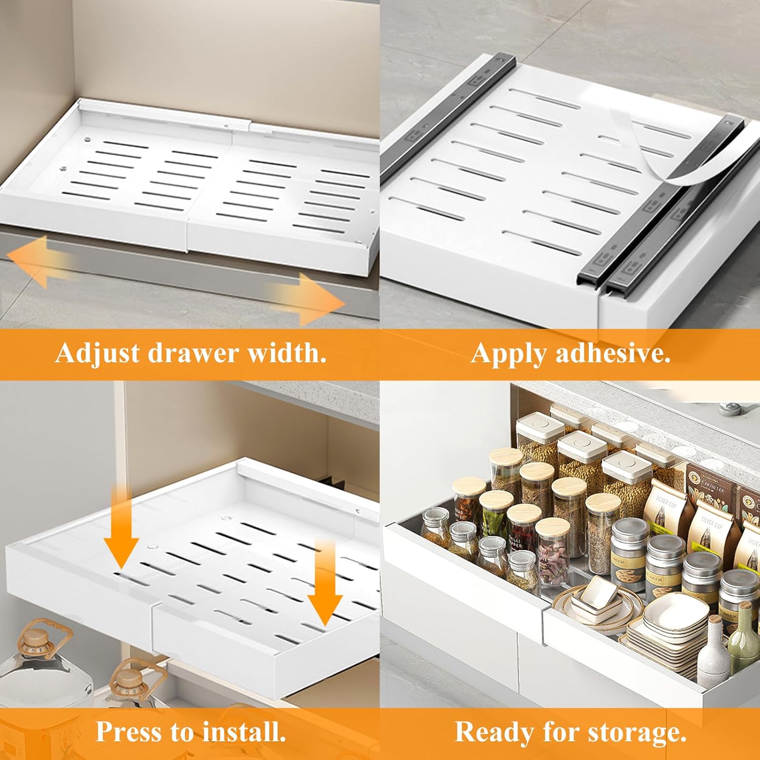 Pull Out Drawer Cabinet Organizer for Kitchen Get Organized -FIRMLY ADHESIVE - NO DRILLING NEEDED: This Expandable peel and stick pull out cabinet organizer is simple and easy to install. No need screws, drilling, or nails to install. What you need to do is tear off the nano glue film and install it in the cabinet. -MULTI-USE: This cabinet organizer pull out drawer is perfect for containing and organizing items and keeping in neat. It is a great peel and stick cabinet drawers slide out smoothly for kitchen, pantry, bathroom, living room, office, and so on. Pull out cabinet organizers can make life at home a whole lot easier. No more messy, unorganized cabinets causing the need to rummage deep through to retrieve that one item. With a cabinet organizer, you can retrieve that one item with minimal effort due to the damping guide rail.