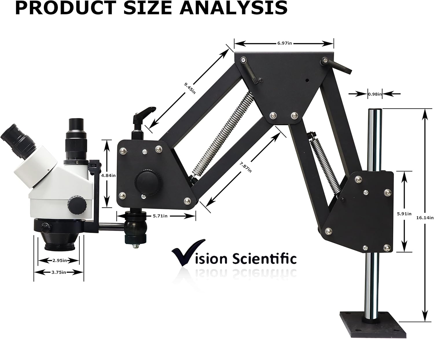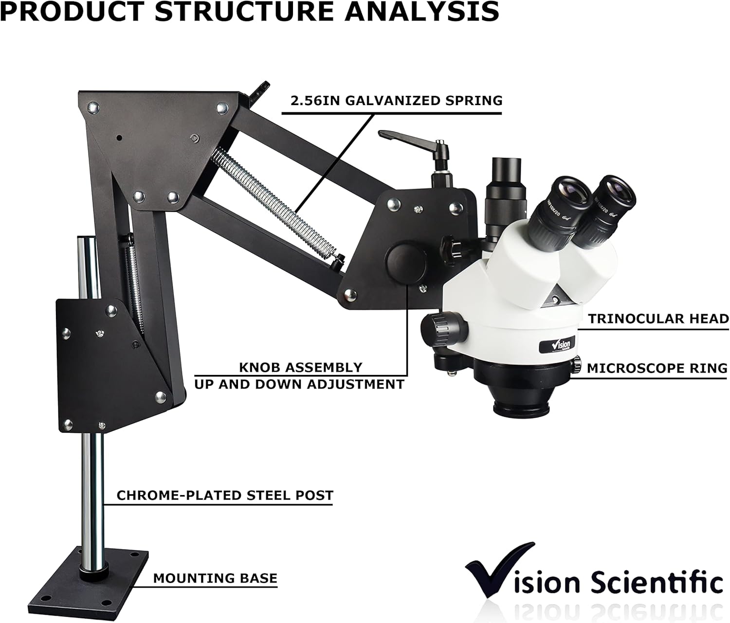 This trinocular zoom stereo microscope is ideal for laboratory and industrial applications. Using its high resolution, great depth, and a large field of view, it is the perfect instrument for viewing any three-dimensional specimen or large objects. The gimbals spring brackets with aesthetic and practical structure are suitable for variety of height, azimuth work and working environment. Flexible telescopic mechanical focusing mechanism makes the operation more convenient. The unique head rest frame helps the operator to exempt fatigue and improve work efficiency.Packed in a fitted Styrofoam box, and includes a dust cover.SpecificationsHead: Trinocular, 45° inclined, rotates 360°Eyepiece: 10x WF / 20mm high eye pointZoom Range: 0.7x—4.5x, 1:6.4 zoom ratioMagnification Range: 7x—45xWorking Distance: 100 mm standardFocusing: Heavy duty rack and pinion focusing arm with tension adjustmentStand: Micro-inserts Stand with Multi-Directional Spring BracketPacking ListTrinocular zoom stereo microscope headPair of 10x WF eyepiecesMicro-inserts stand with Multi-Directional Spring BracketPair of eye guardsOne dust coverShipping Information20” x 20” x 8”80 lbs